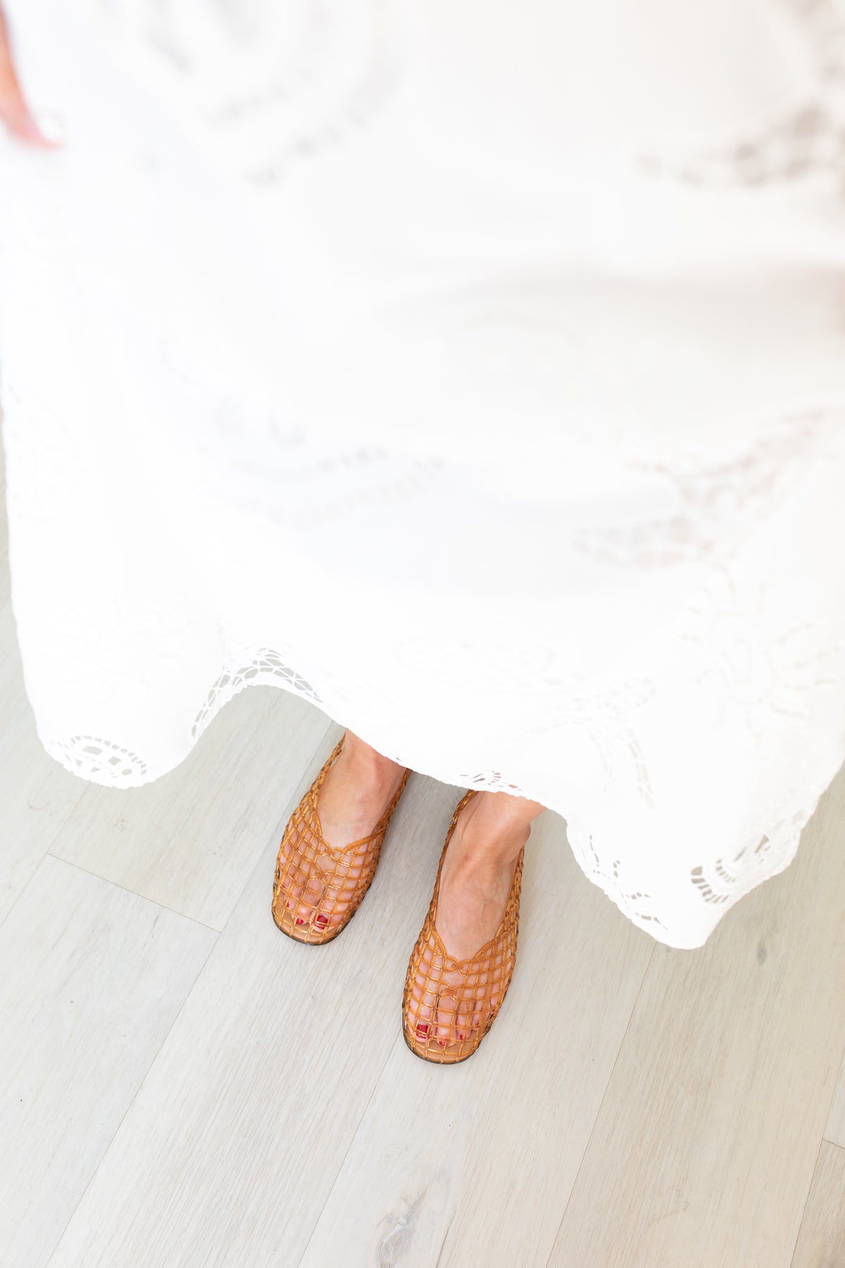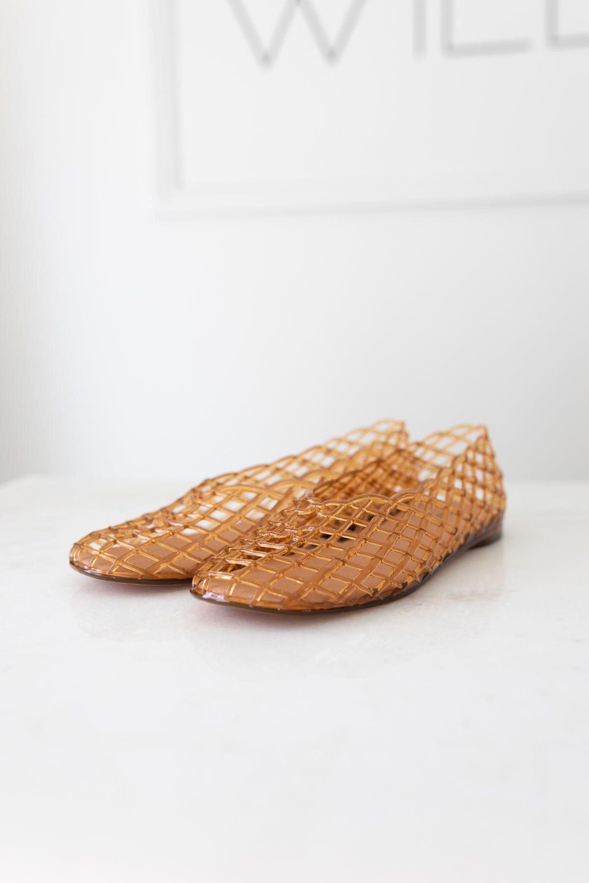 JELLY MESH FLATS -PVC Woven Ballet Flat These shoes redefine the classic ballet flat with a nostalgic, translucent PVC construction and a chic, all-over woven texture. Designed for comfort and versatility, the water-resistant material and flat sole make them the perfect stylish choice for beach days, errands, or casual outings. The soft scalloped edge adds a delicate, feminine finish.