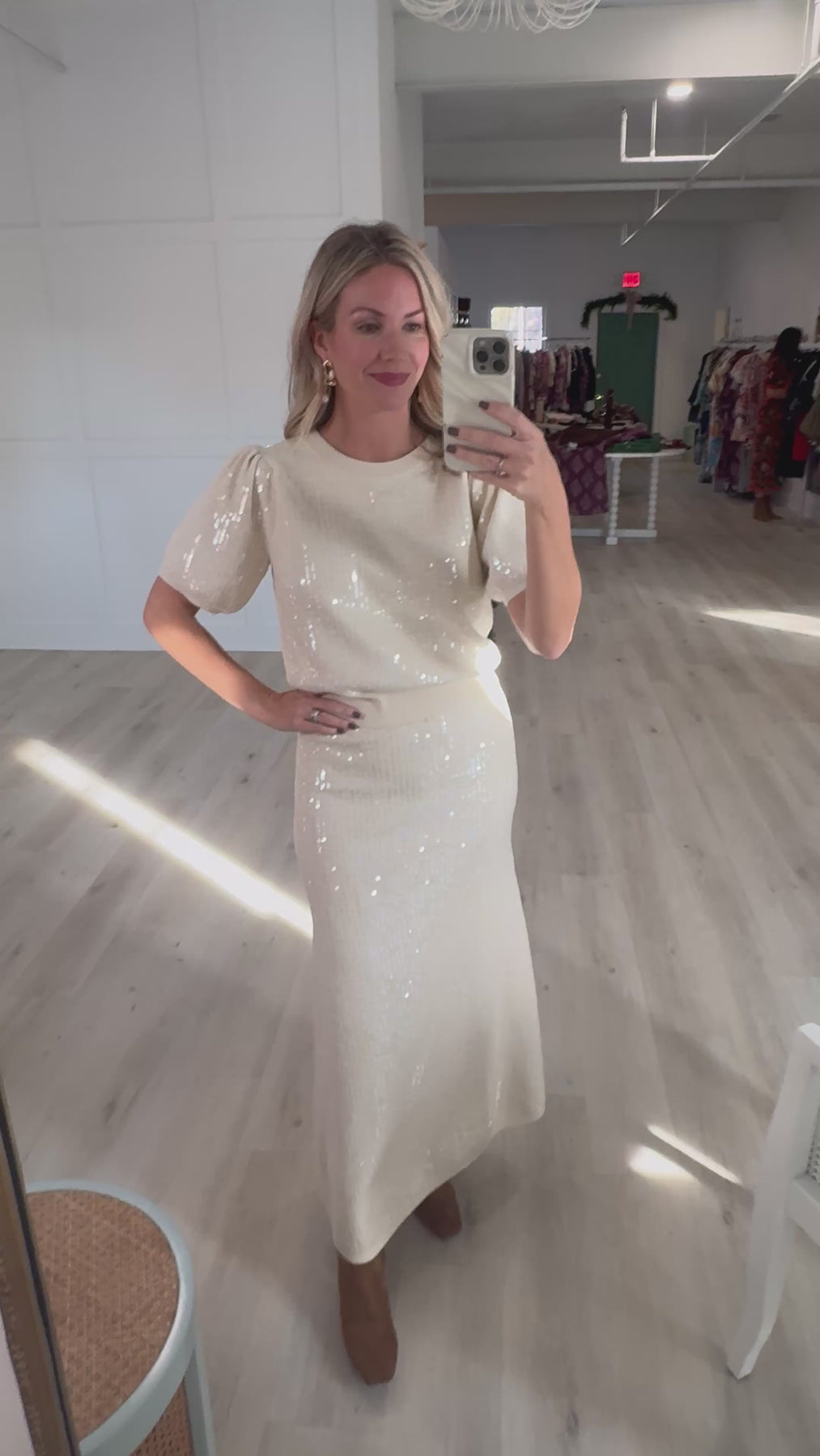 This short sleeve knit top is woven with subtle sequins for a soft shimmer that catches the light. Combining comfort and glam, it's an easy way to dress up your everyday looks or add sparkle to a night out ensemble.
