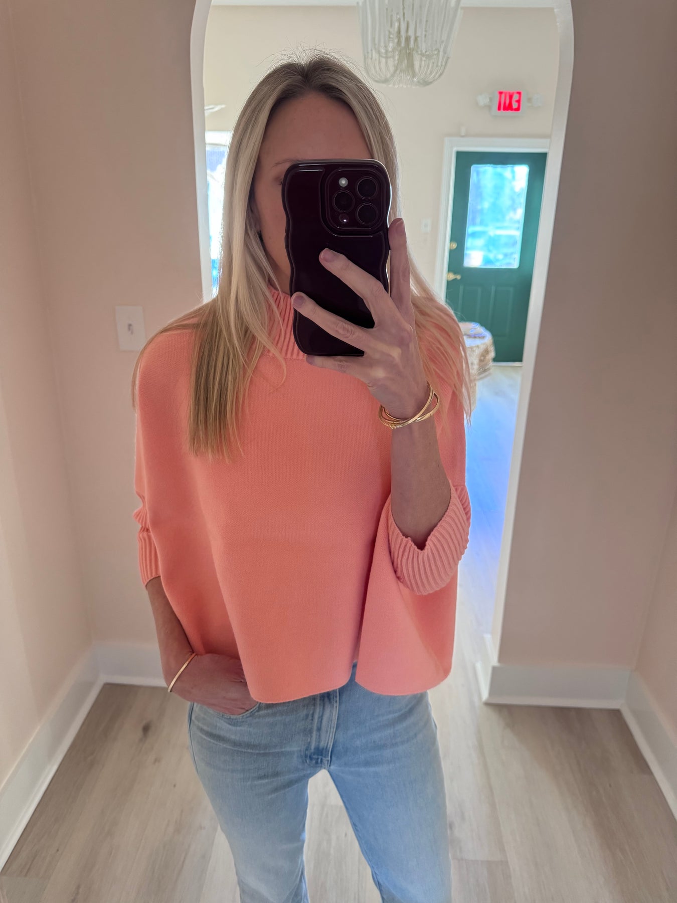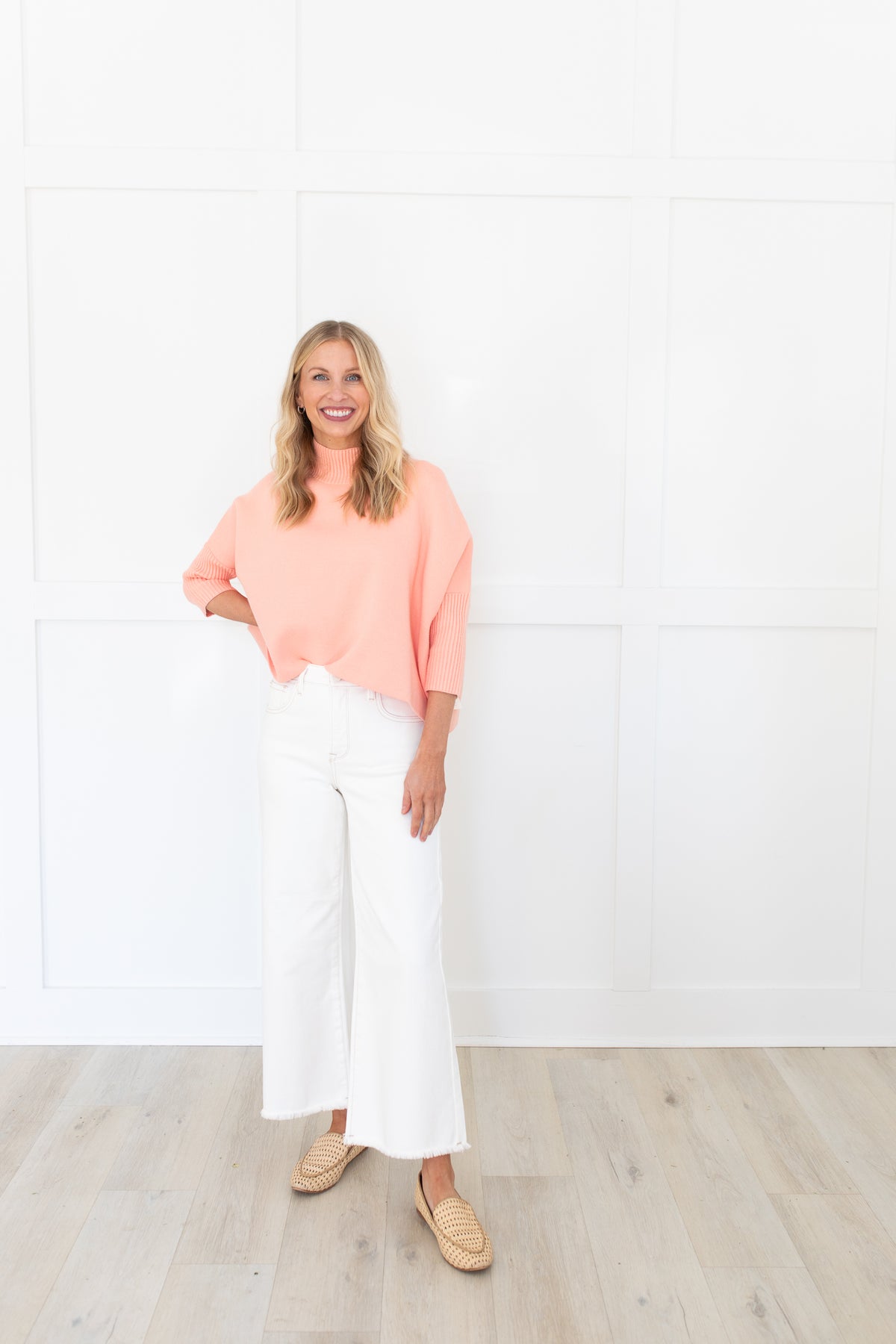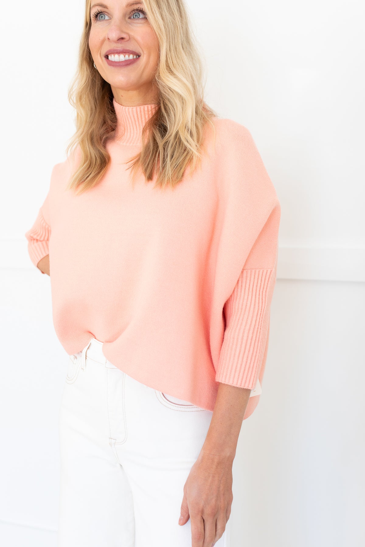 Oversized boxy sweater with fitted rib turtleneck & 3/4 sleeves