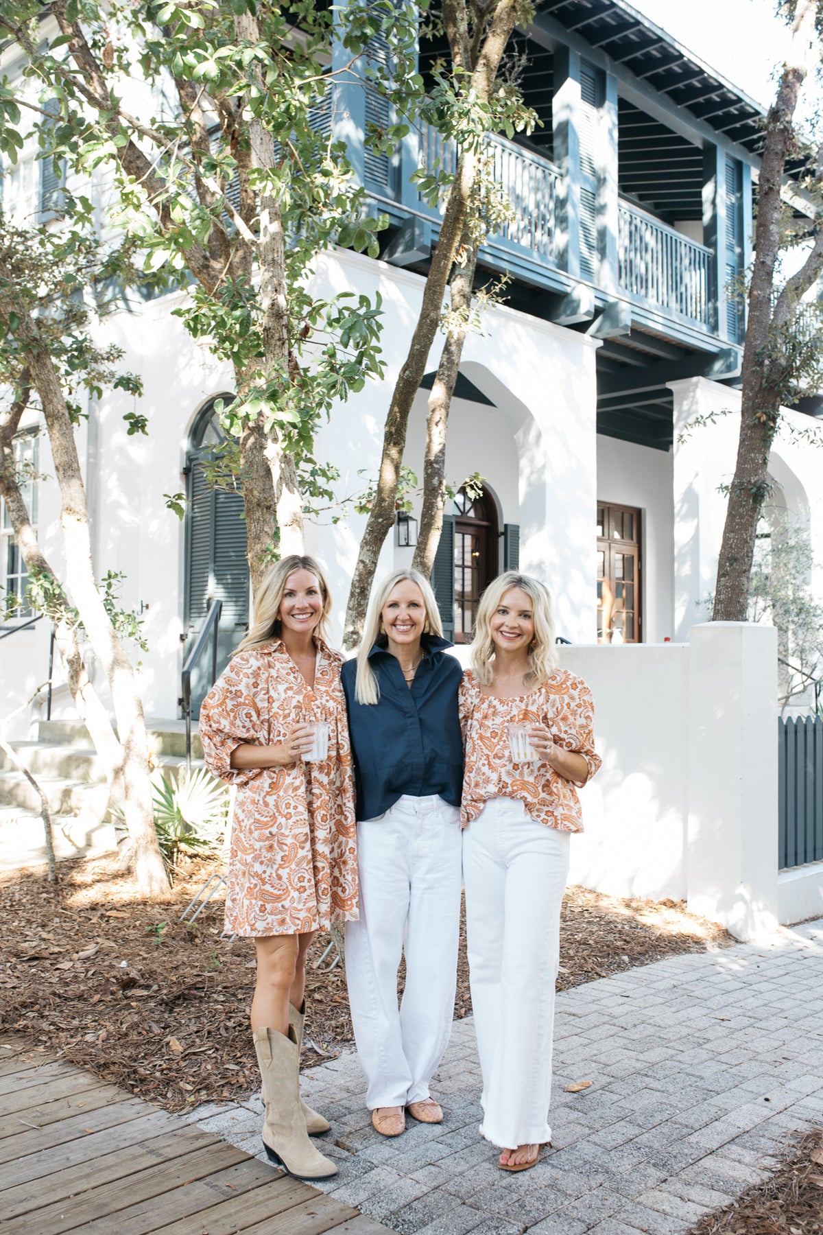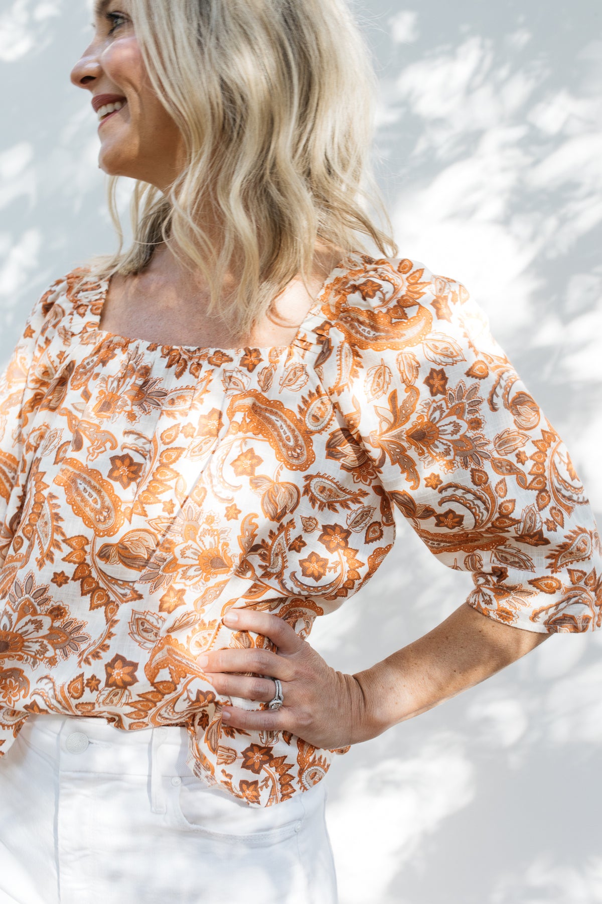The Mason Top features a paisley floral print in orange, white and latte, creating a fresh fall look. It has a relaxed fit with a square neckline.