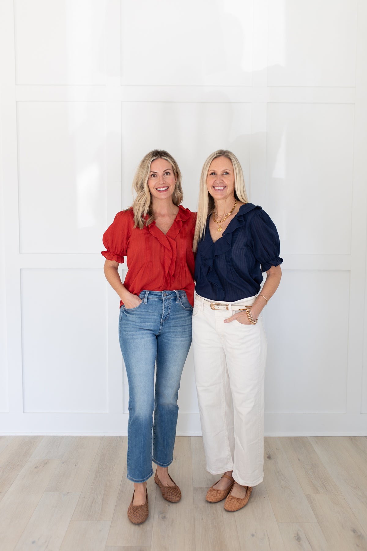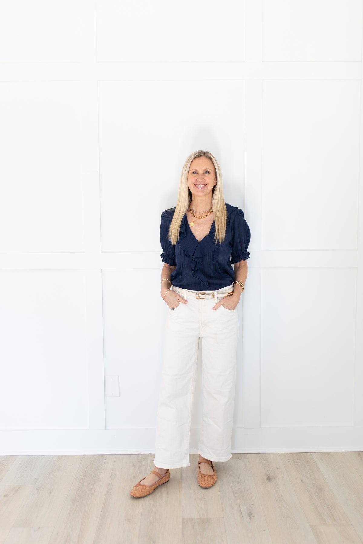 Woven Cotton Buttondown V-Neck Short Sleeve Top With Ruffle Detail