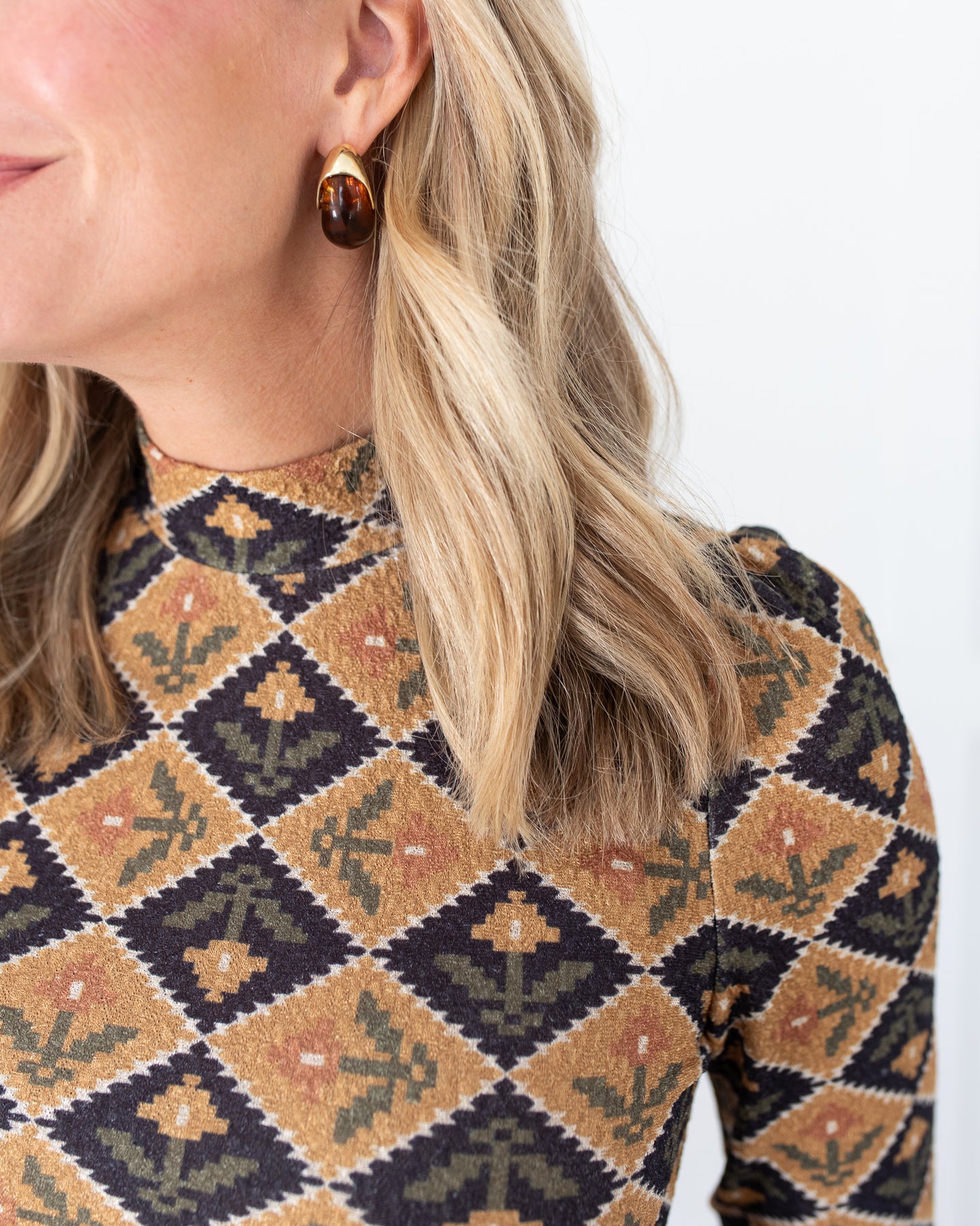 * Fabric: 97% polyester 3% spandex * Mock neckline * Stretch knit for a comfortable, fitted silhouette * Pull-on style Fit Notes *This top runs true to size. Care Instructions * Machine wash cold on a gentle cycle. Lay flat to dry. Iron on low. Shipping