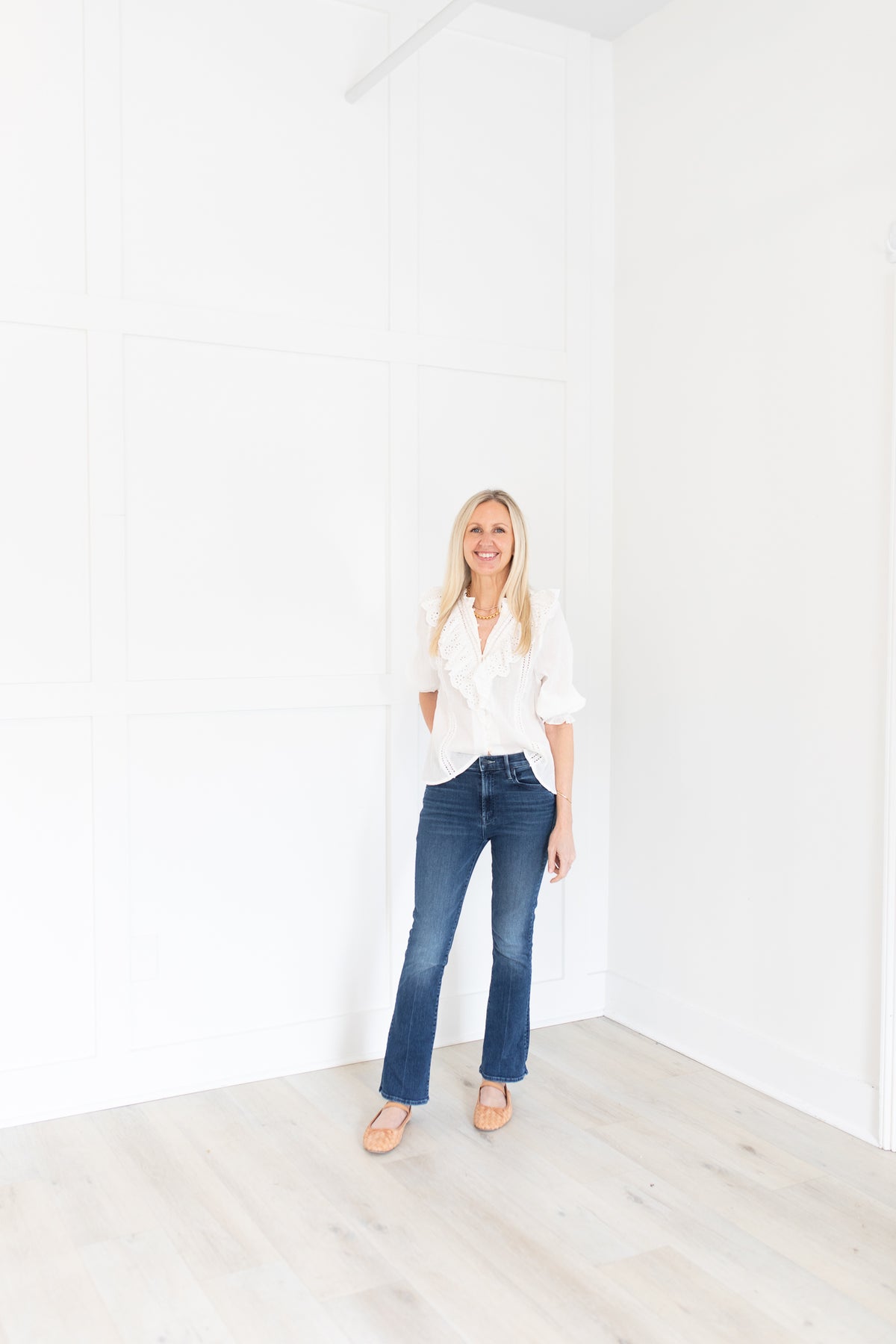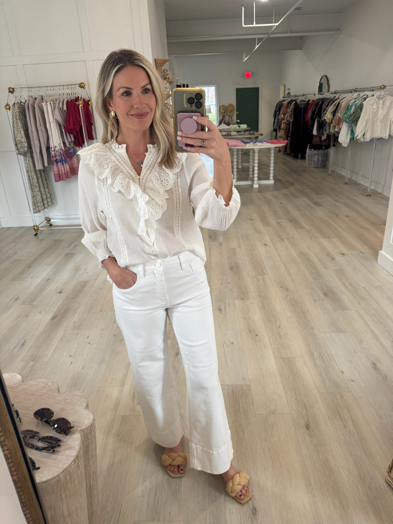 White Eyelet Top With Buttons and Three Quarter Length Sleeves