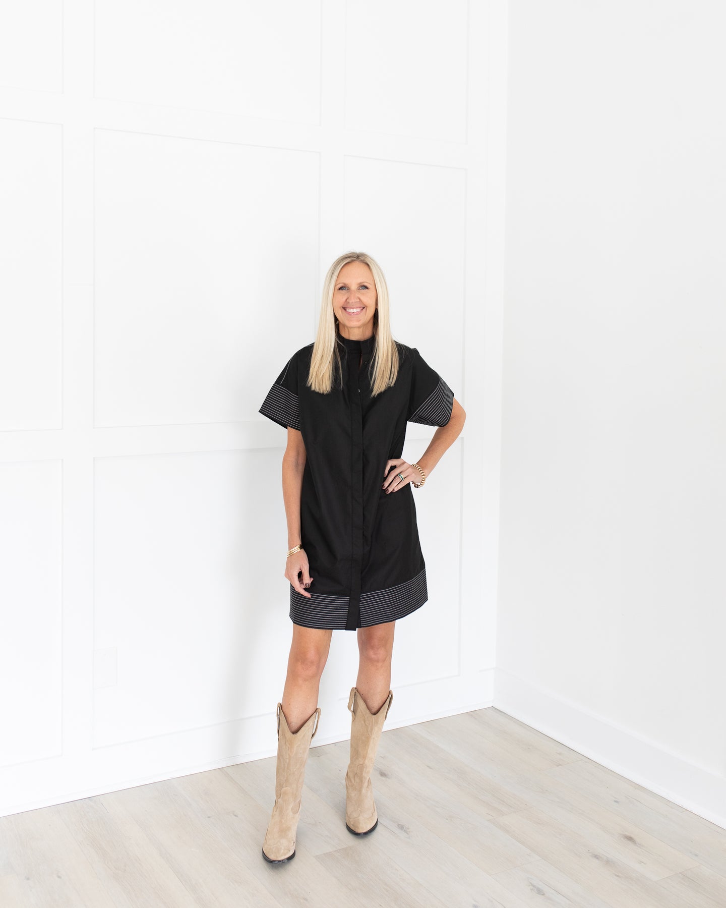 Black mini dress with Button Front. Stitching on Sleeves and hem