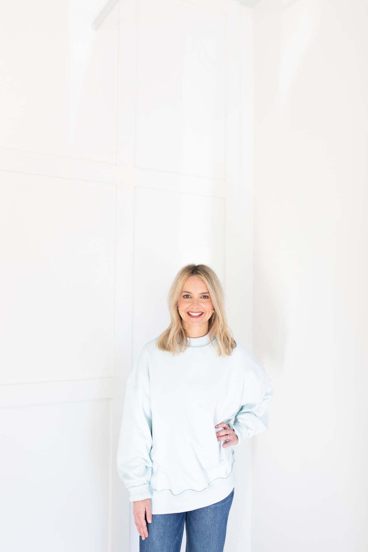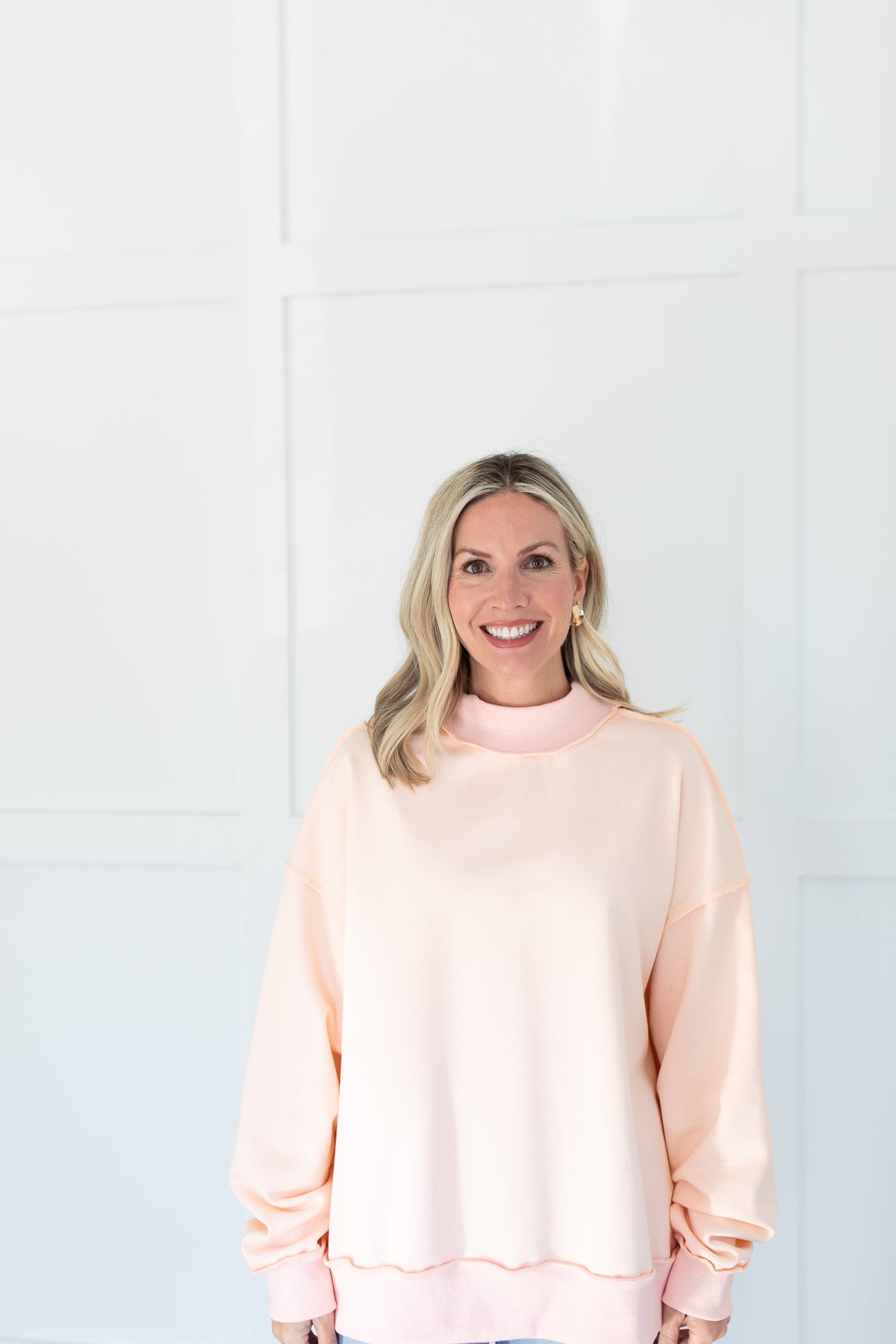 A relaxed-fit pullover top featuring a mock neckline and drop shoulders. Designed with long sleeves, ribbed cuffs and hem, and a soft knit fabric.